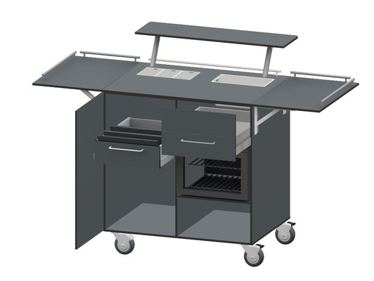 Ablagen und Arbeitsflächen können vom Servicepersonal beispielsweise zum Falten von Servietten oder zum Vorbereiten von Menagen genutzt werden oder zum Aufstellen von Geräten z.B.: Ausgabegeräte für Getränke und Snacks sowie Geschirr etc. Zusätzliche Arbeits-, oder Abstellflächen können bei Bedarf durch Thekenaufsatz-, und / oder praktische ausklappbare Ablagen zur Verfügung gestellt werden.