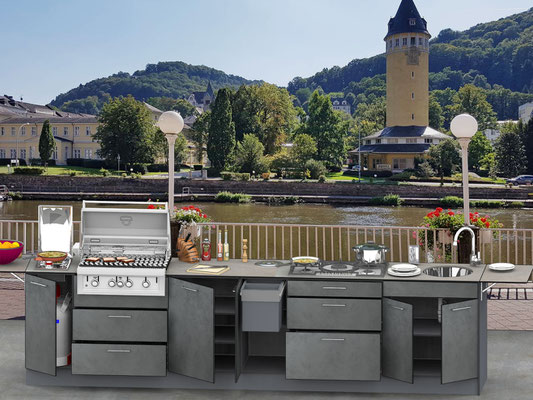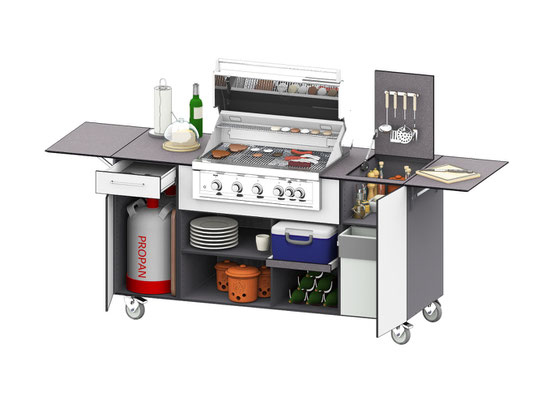 Ablagen und Arbeitsflächen können zum Vorbereiten von Speisen genutzt werden Grills, Bräter und Kochstellen sowie Spülen und Abfallsammler, alles griffberet.